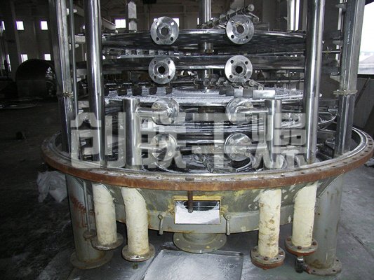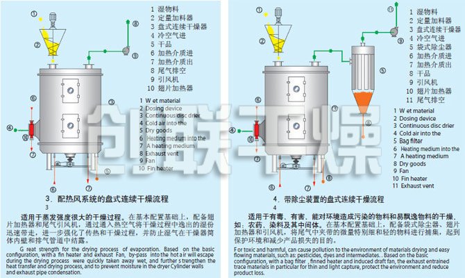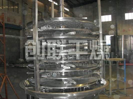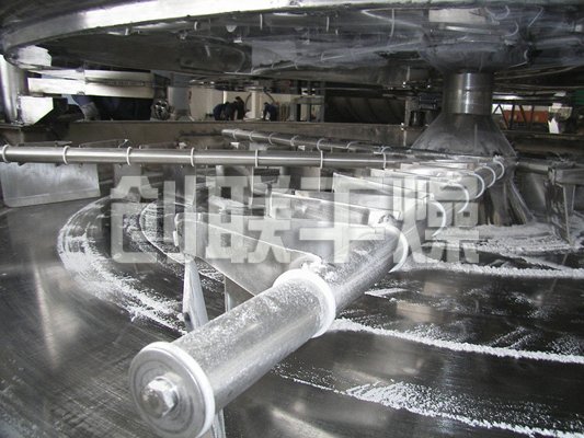 濕物料自加料器連續地加到干燥器上部第一層干燥盤上,帶有耙葉的耙臂作回轉運動使耙臂作回轉運動使耙葉連續地翻抄物料。物料沿指數螺旋線流過干燥盤表面,在小干燥盤上的物料被移送到外緣,并在外緣落到下方的大干燥盤外緣,在大干盤上物料向里移動并從中間落料口落如下一層小干燥盤中。大小干燥盤上下交替排列,物料得以連續地流過整個干燥器。中空的干燥盤內通入加熱介質,加熱介質形式有飽和蒸汽、熱水和導熱油,加熱介質由干燥盤的一端進入,從另一端導出。已干物料從最后一層干燥盤落到殼體的底層,最后被耙葉移送到出料口排出。濕份從物料中逸出,由設在頂蓋上的排濕口排出,真空型盤式干燥器的濕氣由設在頂蓋上的真空泵口排出。從底層排出的干物料可直接包裝。通過配加翅片加熱器、溶劑回收冷凝器、袋式除塵器、干料返混機構、引風機等輔機,可提高其干燥的生產能力,干燥膏糊狀和熱敏性物 料,可方便地回收溶劑,并能進行熱解和反應操作。