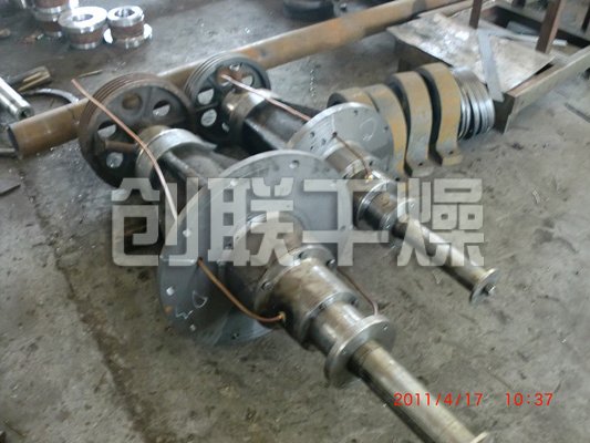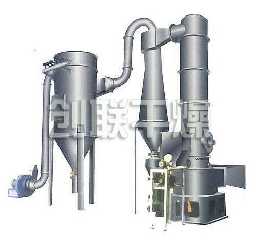 熱空氣切線進入干燥器底部,在攪拌器帶動下形成強有力的旋轉風場。膏狀物料由螺旋加料器進入干燥器內,在高速旋轉攪拌槳的強烈作用下,物料受撞擊、磨擦及剪切力的作用下得到分散,塊狀物料迅速粉碎,與熱空氣充分接觸、受熱、干燥。脫水后的干物料隨熱氣流上升,分級環將大顆粒截留,小顆粒從環中心排出干燥器外,由旋風分離器和除塵器回收,未干透或大塊物料受離心力作用甩向器壁,重新落到底部被粉碎干燥。