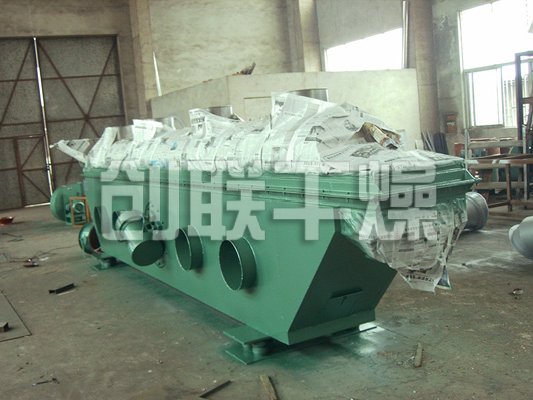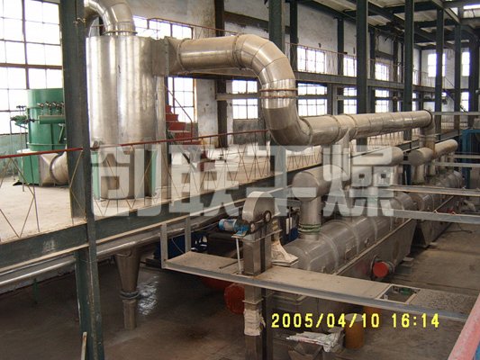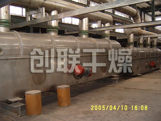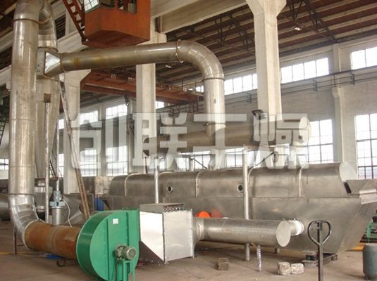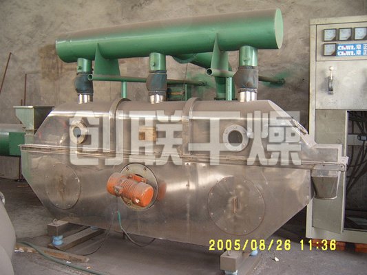 物料自進料進口進入機內(nèi),在振動力作用下,物料沿水平面流化床拋擲,向前連續(xù)運動,熱風(fēng)向上穿過流化床同濕物料換熱后,濕空氣經(jīng)旋風(fēng)分離器除塵后由排風(fēng)1:3排出.干燥物料由排料進口排出。