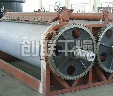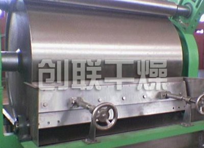 滾筒干燥機是一種內(nèi)加熱傳導型轉(zhuǎn)動連續(xù)干燥設備。旋轉(zhuǎn)的滾筒通過其下部料槽,粘附著一厚度的料膜,熱量通過管道輸送至滾筒內(nèi)壁,傳導到滾筒外壁,再傳導給料膜,使料膜中的濕得到蒸發(fā)、脫濕、使含濕分的物料得到干燥。干燥好的物料被裝置在滾筒表面的刮刀鏟離滾筒,到置于刮刀下方的螺旋輸送器,通過螺旋輸送器將干物料集中、包裝。